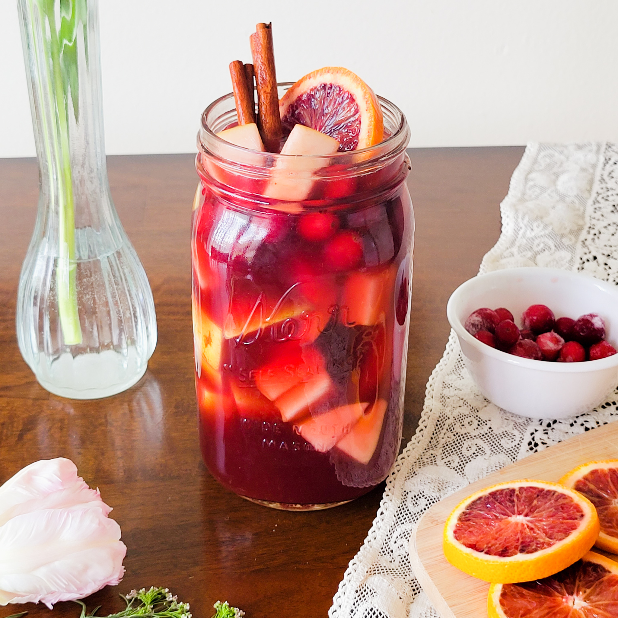 - Combine the diced pear, sliced orange, and cranberries to a jar or pitcher.